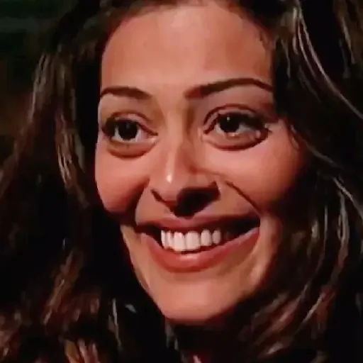 Rosto de uma mulher com sorriso largo e dentes aparecendo, cabelo castanho e olhos castanhos. Fundo escuro.