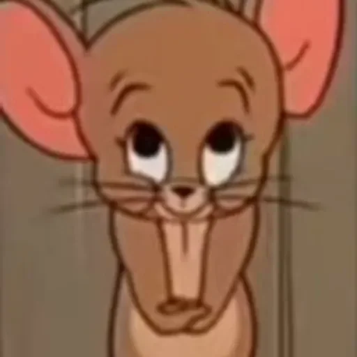 Rato cartoon com expressão surpresa ou confusa, orelhas grandes rosa, olhos pretos e bigodes finos.