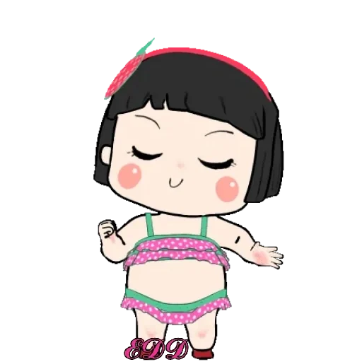 Menina de biquíni rosa com detalhes verdes, cabelo preto e faixa vermelha na cabeça, olhos fechados e bochechas rosadas.