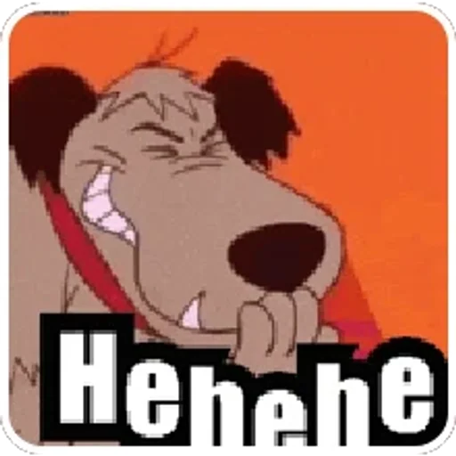 Um cão com expressão de alegria e dentes arreganhados, com a mão no queixo e o texto 'Hehehe' em destaque.