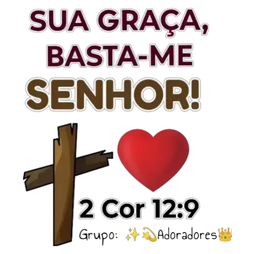 Uma cruz de madeira com um coração vermelho ao lado, com o texto 'SUA GRAÇA, BASTA-ME SENHOR!' em letras grandes coloridas e a referência '2 Cor 12:9' abaixo.