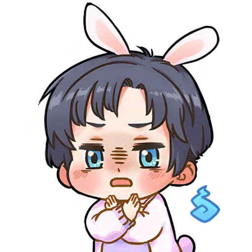 Personagem de anime com orelhas de coelho, expressão de surpresa ou preocupação, mãos no queixo e um símbolo azul ao lado.