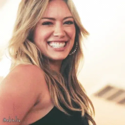 Uma mulher jovem e loira com um sorriso largo e feliz, usando um vestido preto. Ela parece estar ao ar livre em um dia claro.
