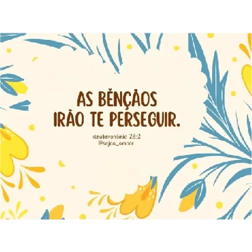 Uma ilustração com fundo creme e decoração de folhas azuis e flores amarelas. No centro, o texto 'AS BÊNÇÃOS IRÃO TE PERSEGUIR.'