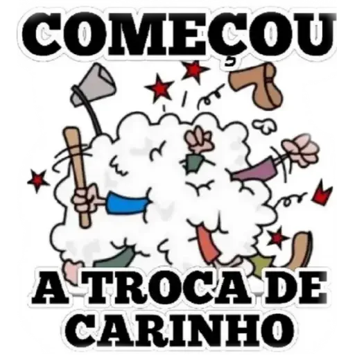 Uma ilustração colorida com a frase 'COMEÇOU A TROCA DE CARINHO' em letras grandes. A imagem mostra vários objetos saindo de uma nuvem, incluindo um martelo, estrelas vermelhas e outras formas.