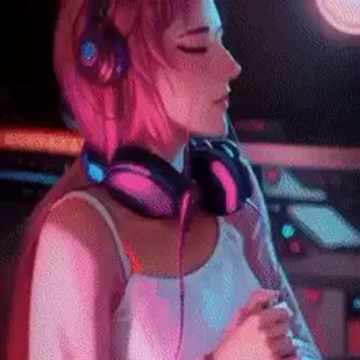 Uma mulher loira usando fones de ouvido e uma camiseta branca, com iluminação rosa e azul, em um ambiente escuro com equipamento de música ao fundo.