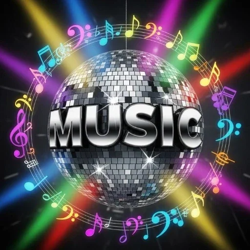 Uma bola de discoteca prateada com o texto 'MUSIC' em letras grandes e pretas, cercada por notas musicais coloridas e raios de luz multicolores.