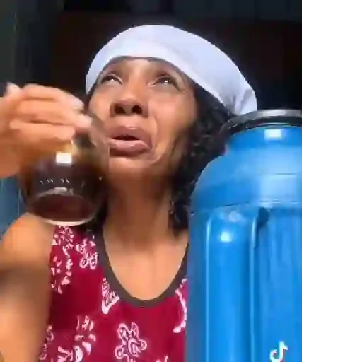 Uma mulher negra bebendo de um copo, usando uma touca branca e uma camiseta vermelha com estampas brancas, ao lado de um botijão de gás azul.