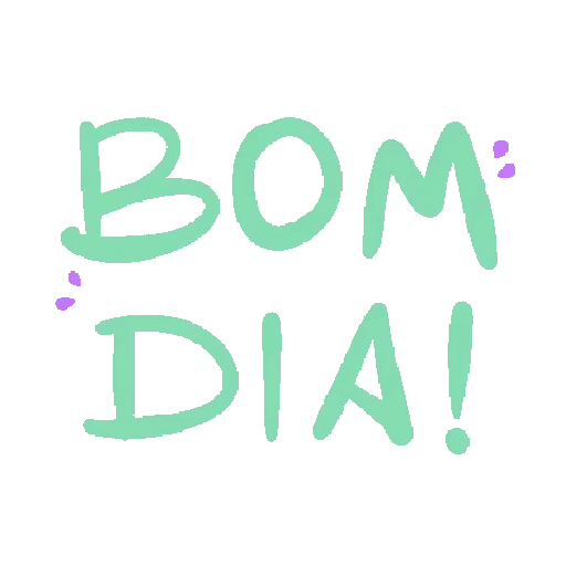 Um desenho simples com a frase 'BOM DIA!' em letras grandes e verdes, com pequenos pontos roxos ao lado.