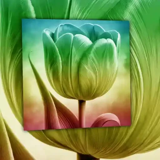 Uma flor de tulipa verde com fundo colorido e folhas grandes ao redor.