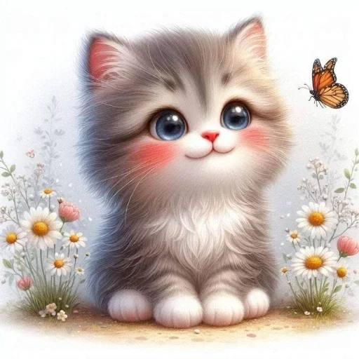 Gatinho fofinho cinza com olhos azuis grandes e bochechas rosadas, sentado entre flores brancas e amarelas, com uma borboleta laranja ao lado.