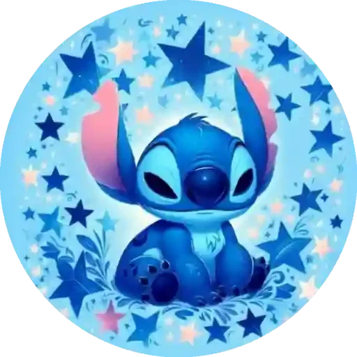 Stitch azul sentado em meio a estrelas azuis, rosa e brancas. O personagem tem orelhas grandes e olhos grandes e expressivos.