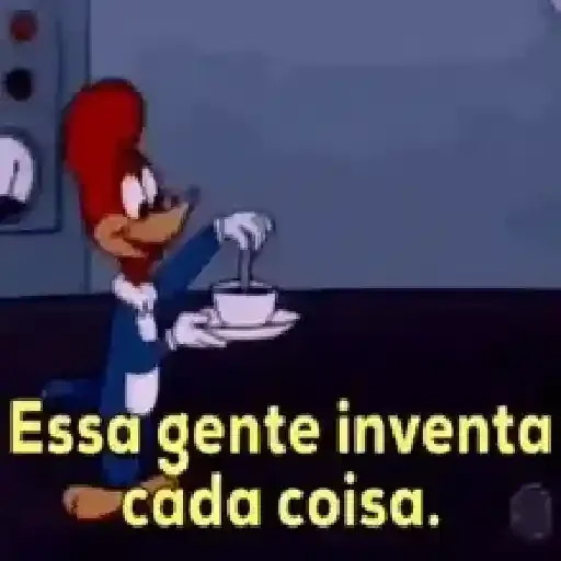 Um personagem de desenho animado, Woody, segurando uma xícara de café com a legenda 'Essa gente inventa cada coisa.'