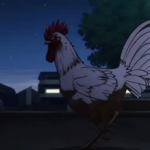 Um galo de desenho animado com expressão séria e olhos estreitos, penas avermelhadas e crista vermelha.