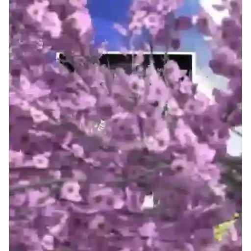 Imagem desfocada de flores roxas contra um céu azul com nuvens brancas.