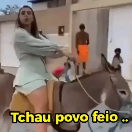 Uma mulher de cabelo castanho, vestida com um conjunto claro, sentada em um jumento, com as mãos estendidas para trás. No canto inferior, aparece o texto 'Tchau povo feio'.
