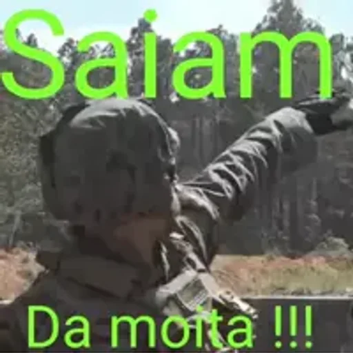 Um soldado em uniforme, com o braço estendido apontando para a direita, em meio a uma paisagem natural. A imagem tem o texto "Saiam Da moita !!!" em verde.