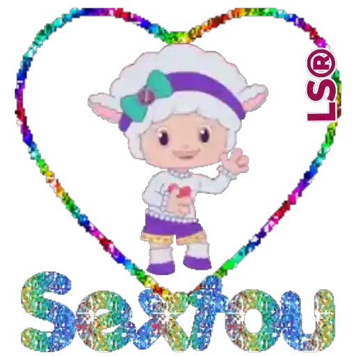 Uma figurinha de uma ovelha fofa com cabelo branco e um laço verde, vestida com uma blusa branca e shorts roxos, dentro de um coração colorido com o texto 'SexyU' abaixo.