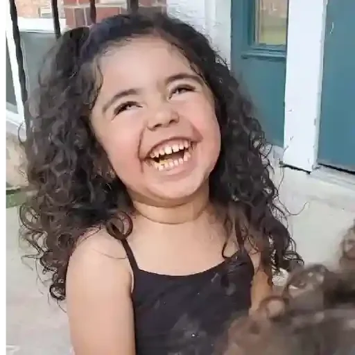 Menina sorrindo com cabelos castanhos encaracolados e um moleton preto