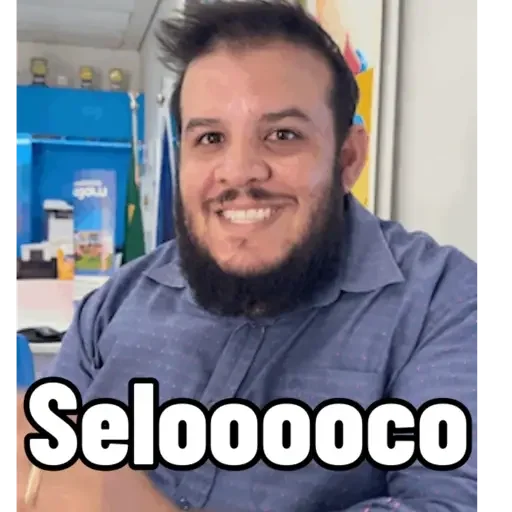 Um homem com barba e cabelo preto sorri com a frase 'Seloooooco' em destaque.