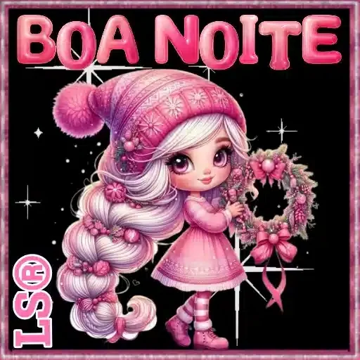 Menina de cabelo branco e rosa vestida de rosa, com touca de neve e um enfeite de Natal na mão. 'BOA NOITE' em letras grandes rosa.