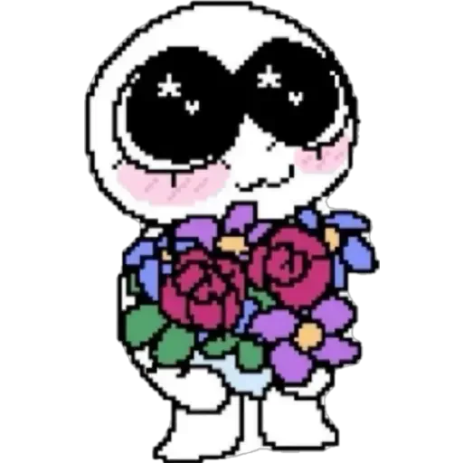 Um personagem de desenho animado com olhos grandes e sonolentos segura um buquê de flores coloridas, incluindo rosas vermelhas, flores roxas e azuis, com bochechas cor-de-rosa.