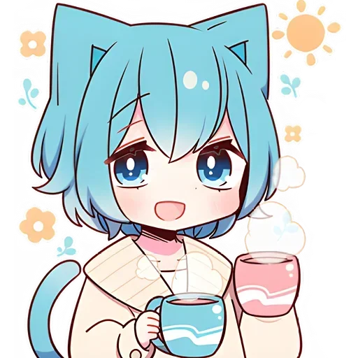 Uma menina de anime com cabelo azul e orelhas de gato segura duas xícaras de café, uma azul e outra rosa, com um fundo de flores e sol.