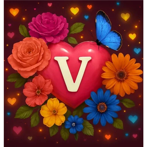 Um coração vermelho com a letra 'V' no centro, rodeado de flores coloridas, incluindo rosas, margaridas e outras flores, além de um borboleta azul e corações pequenos no fundo.