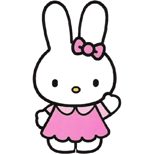 Rosto de Hello Kitty com um laço rosa, fazendo um gesto com a mão e com dois triângulos rosas atrás da cabeça.