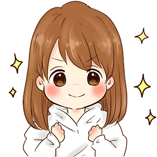 Garota de cabelos castanhos com expressão feliz, bochechas rosadas e estrelas ao redor.