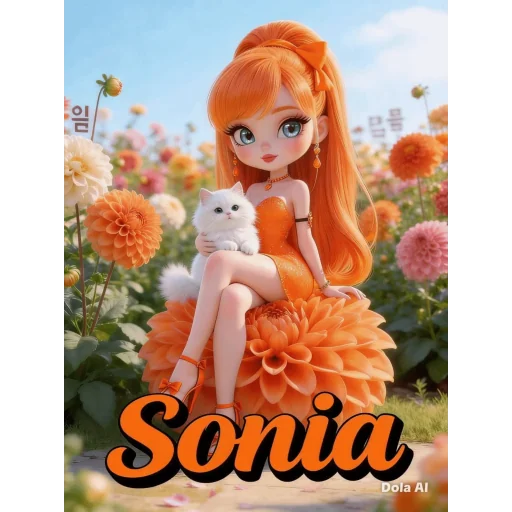 Uma menina de cabelo laranja sentada em uma flor laranja com um cachorro branco no colo, em um jardim de flores coloridas. O nome 'Sonia' está escrito em laranja na parte inferior.