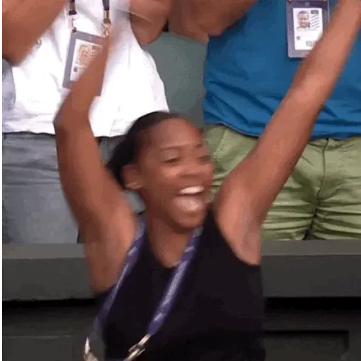 Uma mulher negra com os braços levantados em celebração, usando um top preto e uma medalha, com pessoas ao fundo.