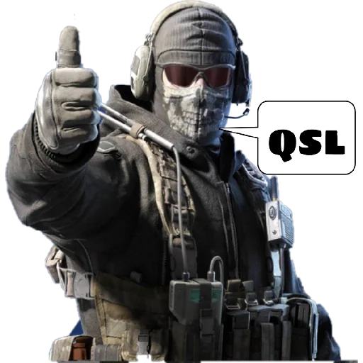 Um personagem de jogo com máscara e óculos de sol dá um polegar para cima e diz 'QSL' em um discurso.
