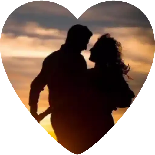 Um casal em silhueta se beijando dentro de um coração ao pôr do sol.