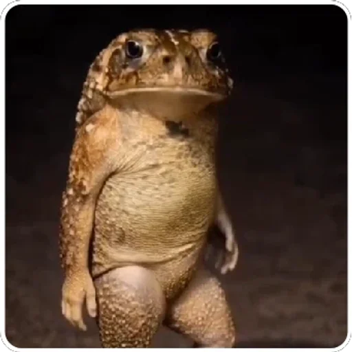 Um sapo marrom claro com olhos grandes e uma expressão séria, em pé sobre as pernas traseiras com as dianteiras ao lado do corpo.