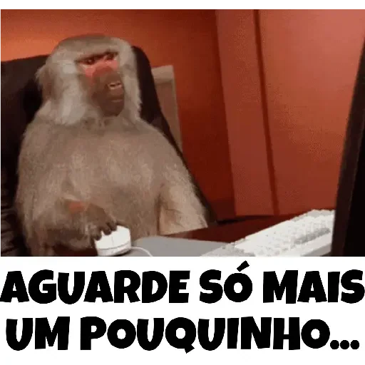 Um macaco sentado em uma cadeira de escritório com as mãos no rosto, parecendo confuso ou exasperado, com o texto 'Qual…