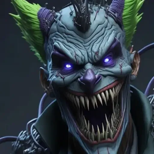 Rosto de um demônio com olhos roxos brilhantes, dentes afiados e chifres. A pele é cinzenta com rugas, e o cabelo é verde espetado.