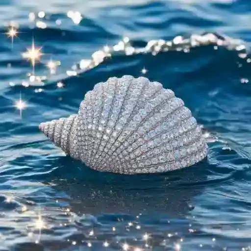 Concha de molusco coberta de brilhantes sobre ondas de água azul com reflexos de luz.