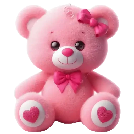 Um ursinho de pelúcia rosa com um laço rosa no cabelo e outro no pescoço, com corações nos pés.