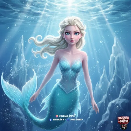 Uma sereia loira com cauda azul-turquesa está submersa em água azul com raios de sol. Ela tem um olhar suave e cabelo ondulado.