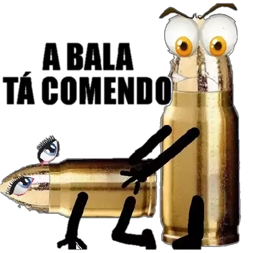 Uma bala de ouro com pernas e olhos, expressão assustada, e texto "A BALA TÁ COMENDO". Outra bala menor com olhos e expressão triste ao fundo.