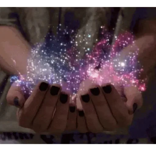 Mãos com unhas pintadas de preto oferecendo uma explosão de estrelas coloridas, em tons de rosa, roxo e branco.