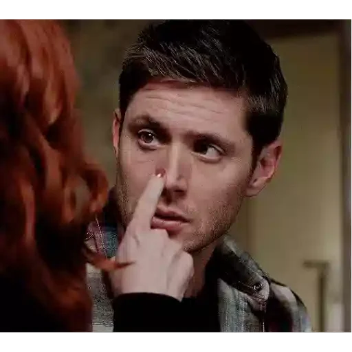Cena de um homem com expressão surpresa e intrigada, com o dedo indicador sobre os lábios, como se pedindo silêncio. Atrás dele, uma mulher de cabelos ruivos.