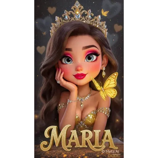 Uma princesa de olhos azuis e cabelos castanhos com uma coroa de joias na cabeça e um vestido dourado. Ela está com a mão no rosto e tem uma borboleta amarela no ombro. O nome 'MARIA' está escrito em letras douradas abaixo dela.