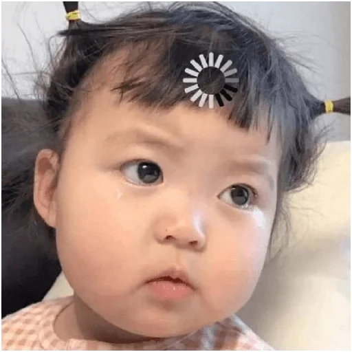 Menina com expressão séria, cabelos castanhos e um acessório branco no cabelo. Ela parece ter uma pequena marca ou brilho no nariz.