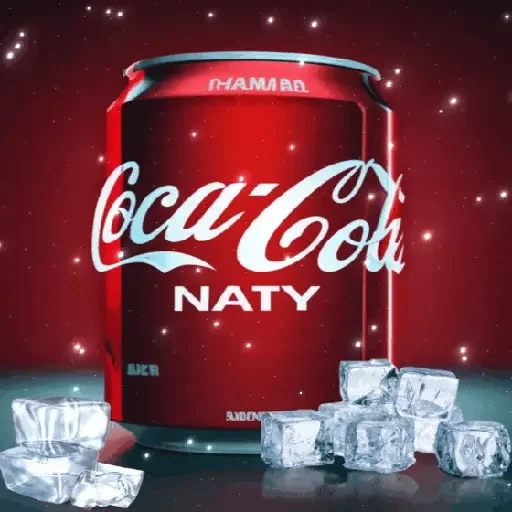 Uma lata de refrigerante Coca-Cola com o nome 'NATY' escrita embaixo da marca, rodeada de cubos de gelo e estrelas de luz no fundo vermelho.