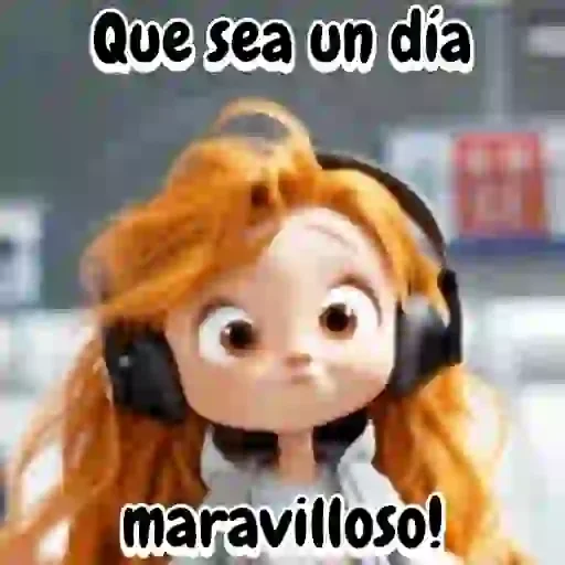 Uma menina de cabelos laranjas usando fones de ouvido e com uma expressão facial neutra, com o texto 'Que sea un día maravilloso!' sobreposto.