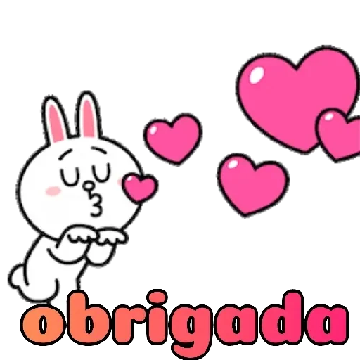 Um coelho branco com orelhas rosadas e bochechas cor-de-rosa aparece com os olhos fechados e as mãos juntas, com um coração rosa na bochecha e três corações rosas ao redor. Abaixo dele, está escrito 'obrigada'.