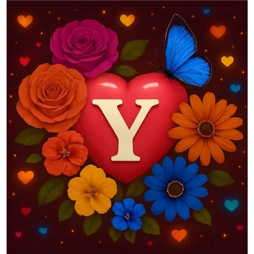 Um coração vermelho com a letra 'Y' em creme, rodeado de flores coloridas, incluindo rosas, margaridas e outras flores, com um borboleta azul e corações pequenos ao fundo.