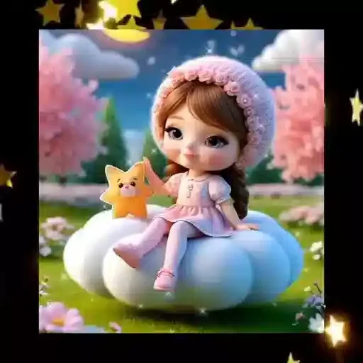Menina de olhos grandes sentada em uma nuvem com um gato laranja, vestindo um chapéu e roupa rosa. Fundo com árvores floridas e céu azul com nuvens.